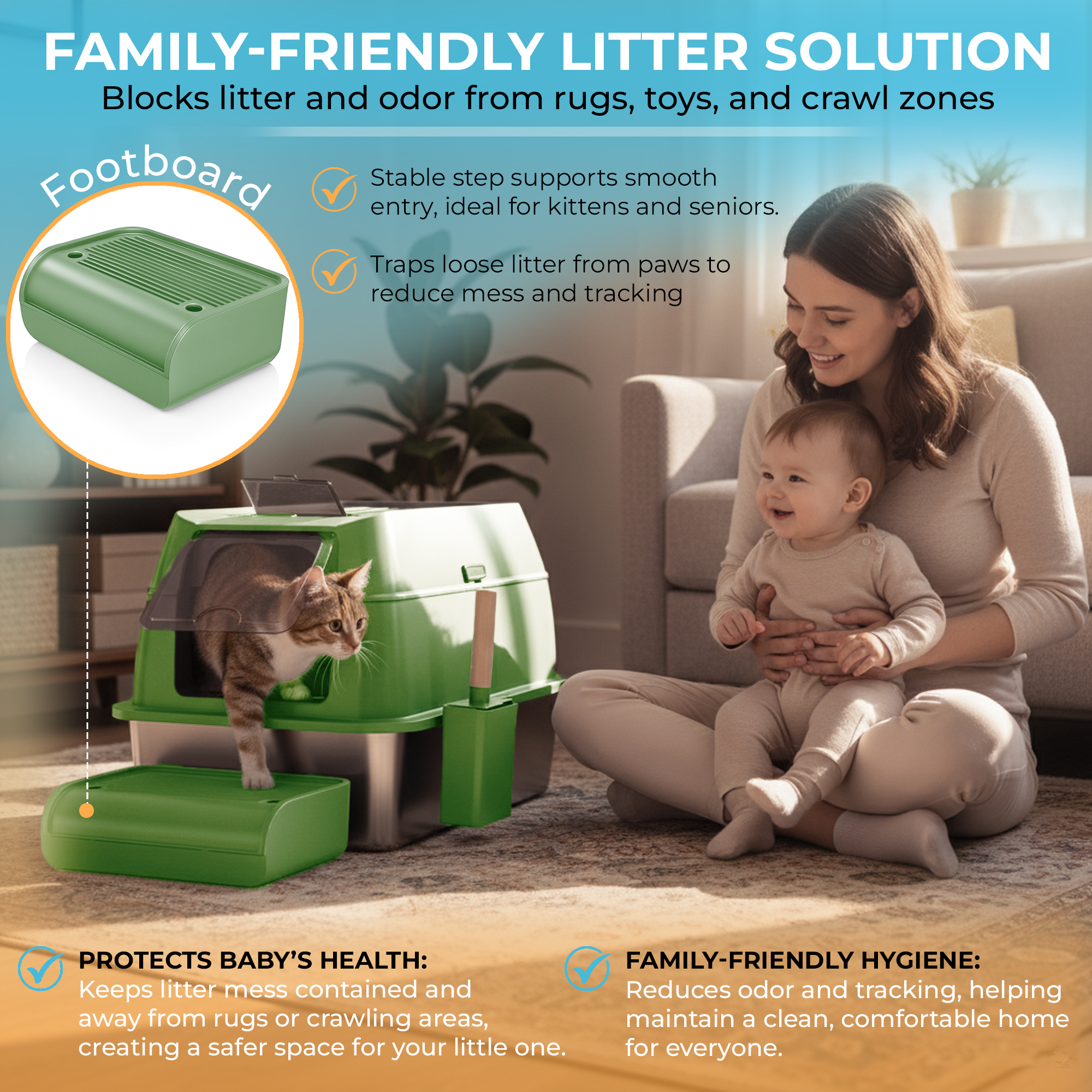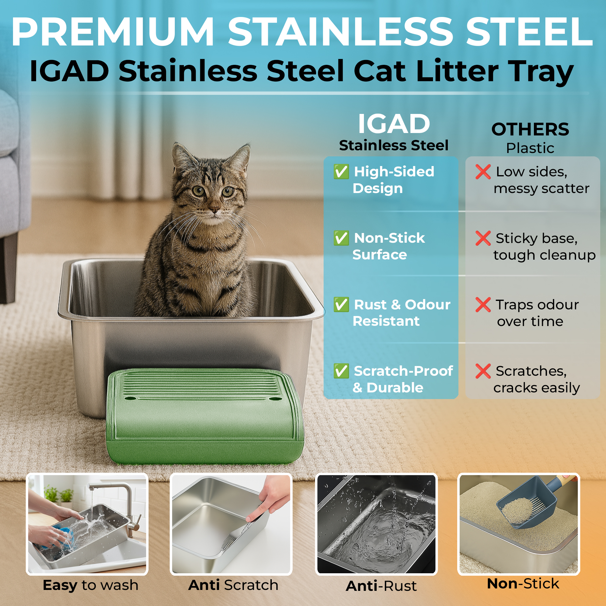 IGAD XXL Stainless Steel Cat Litter Box – High Sides, Non-Stick, Easy Clean, Odour Control, Removable Lid & Scoop (Green)
