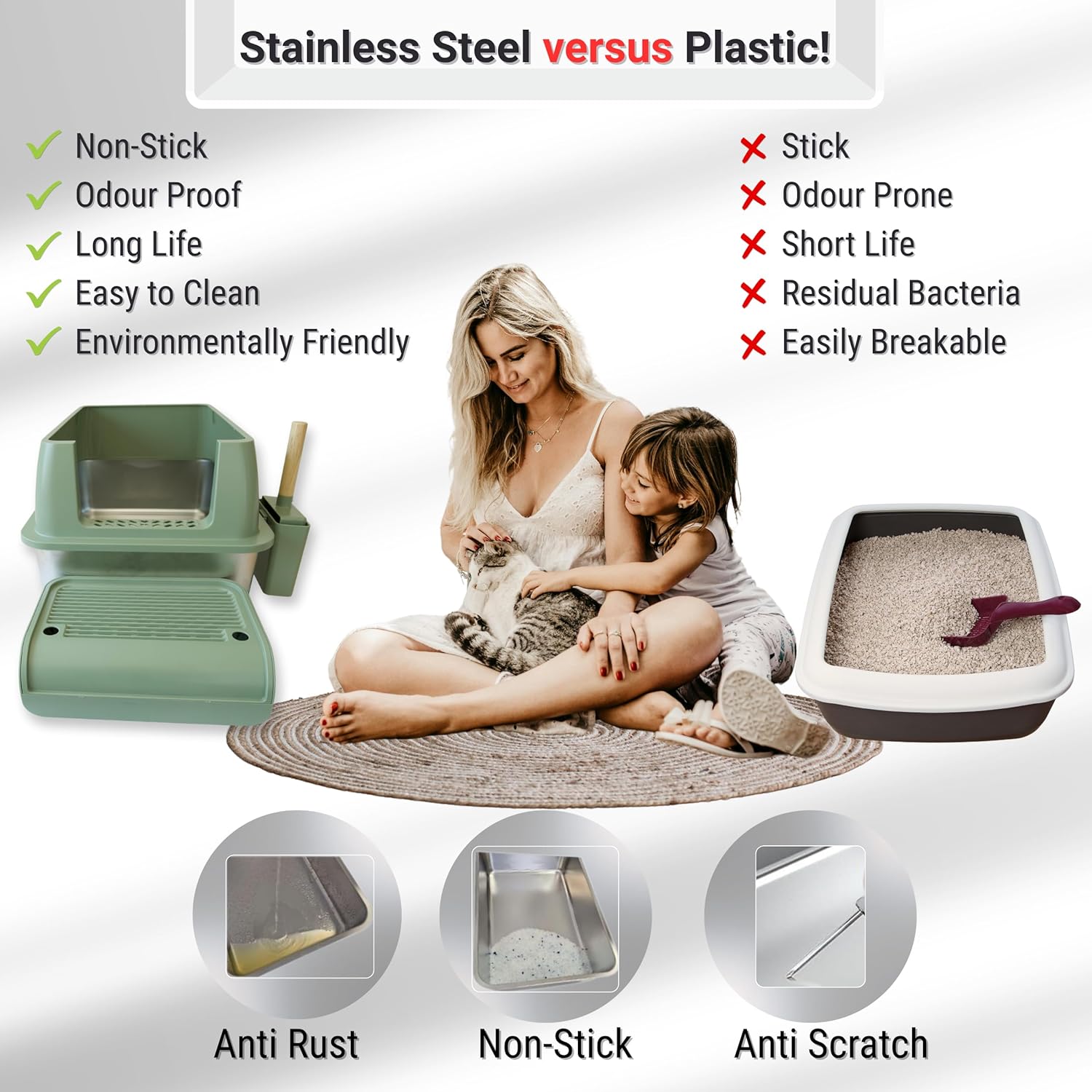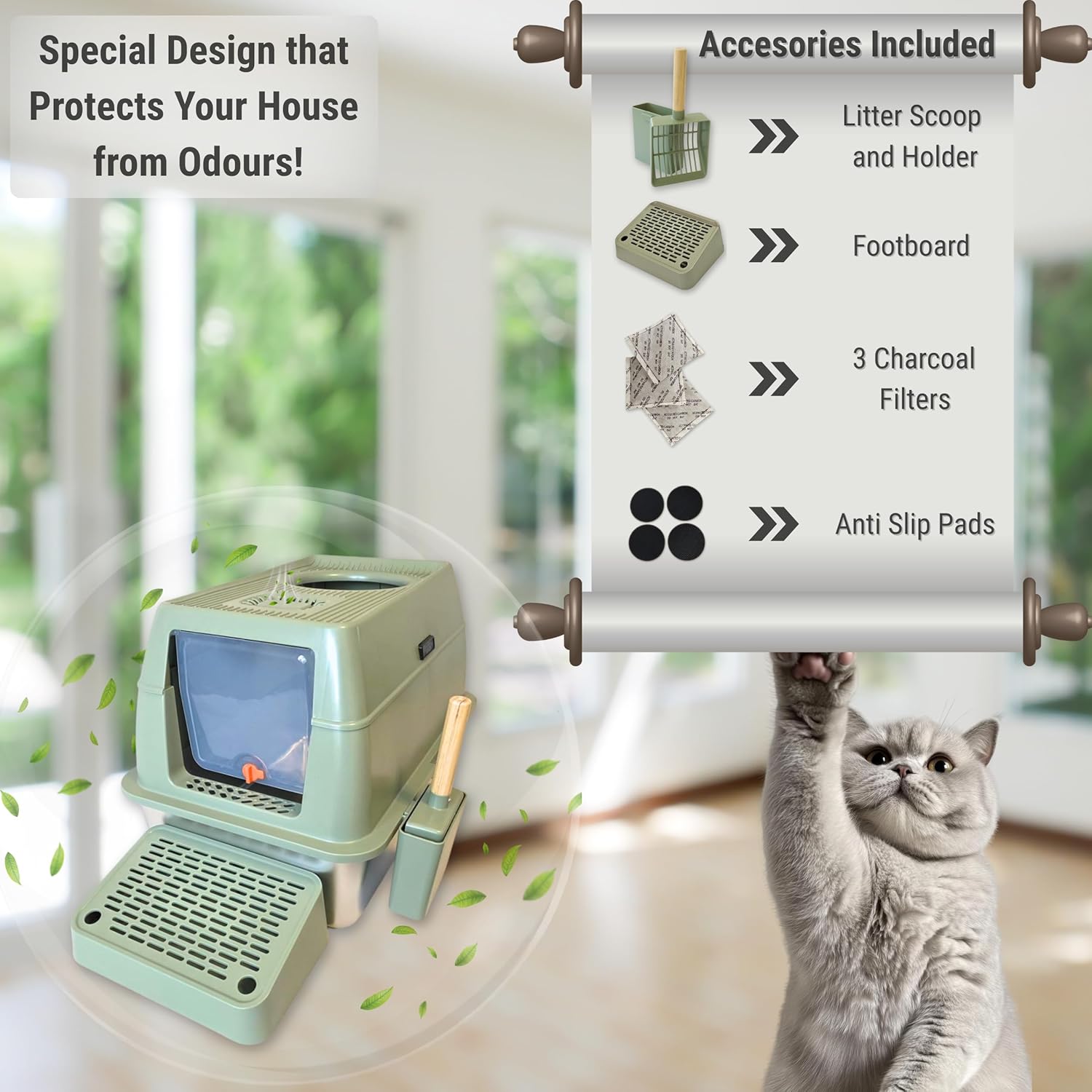 IGAD XXL Stainless Steel Cat Litter Box – High Sides, Non-Stick, Easy Clean, Odour Control, Removable Lid & Scoop (Green Double Entry)
