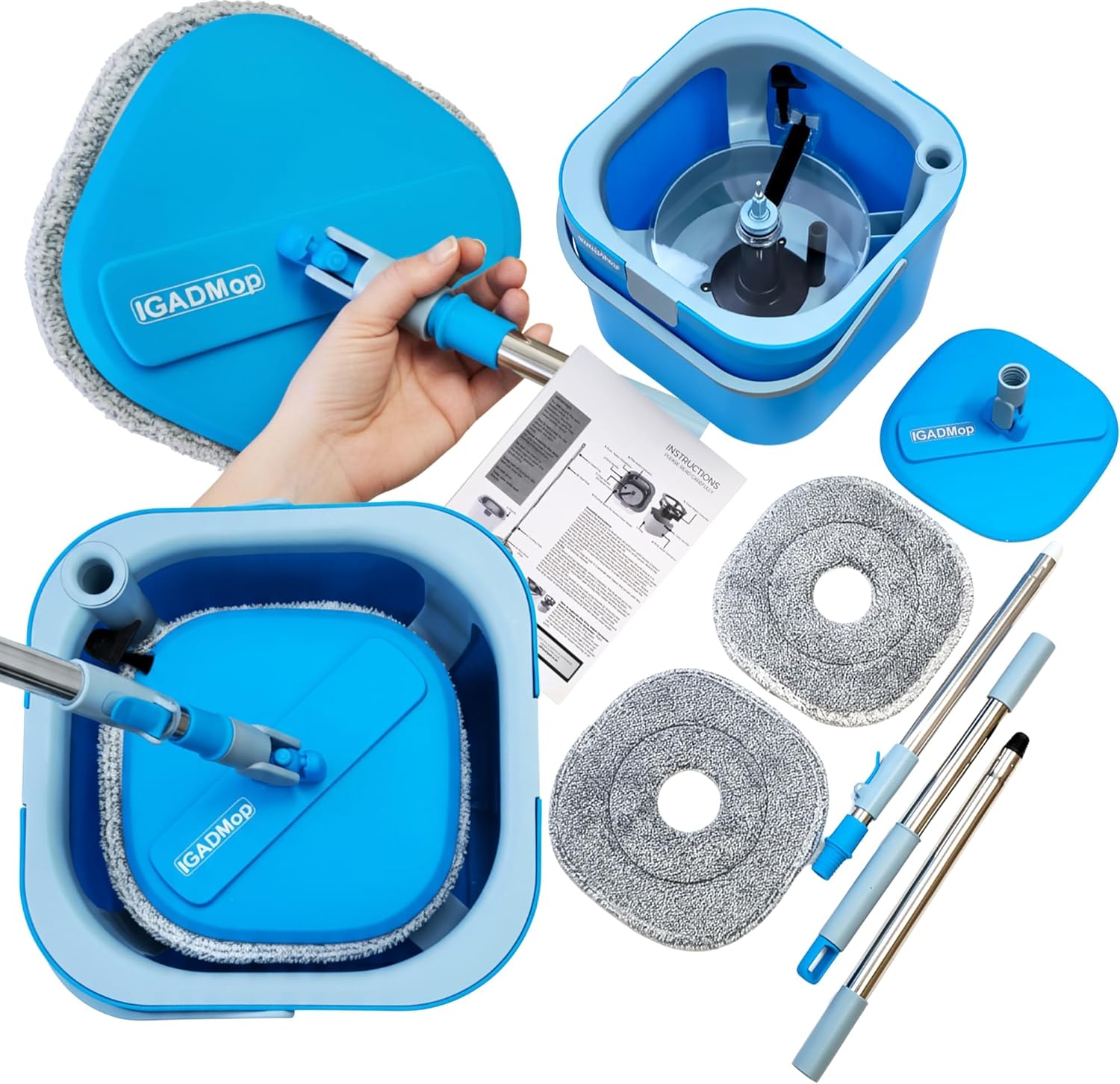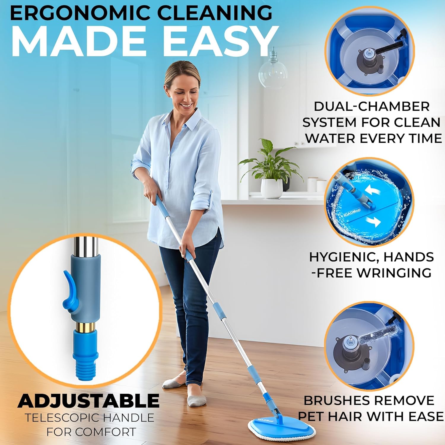 Introducing the high-quality IGADMop professional all-surface bucket with extendable mop, the ultimate tool for all types of floor cleaning. This floor cleaning tool is not just a cleaning bucket, it is a complete surface cleaning kit designed to make floor cleaning tasks easier and more efficient. With its extendable pole, you can clean without bending over thanks to its 130 cm length. With the wringing function, you can easily wring out the mop without having to bend over and you can adjust the humidity for different surfaces. Perfect for allergy sufferers. It effectively absorbs hair and dust with its intelligent brush system. Versatile microfiber sponges for streak-free results: The ultra-absorbent microfiber sponges provide perfect cleaning for all types of floors and windows. Effortlessly removes dirt and provides a streak-free and scratch-free surface - ideal for sparkling results in your home. The IGADMop Floor Cleaning Kit is not just a cleaning device, it is a complete solution for floor cleaning, solar panel cleaning and other outdoor cleaning needs.