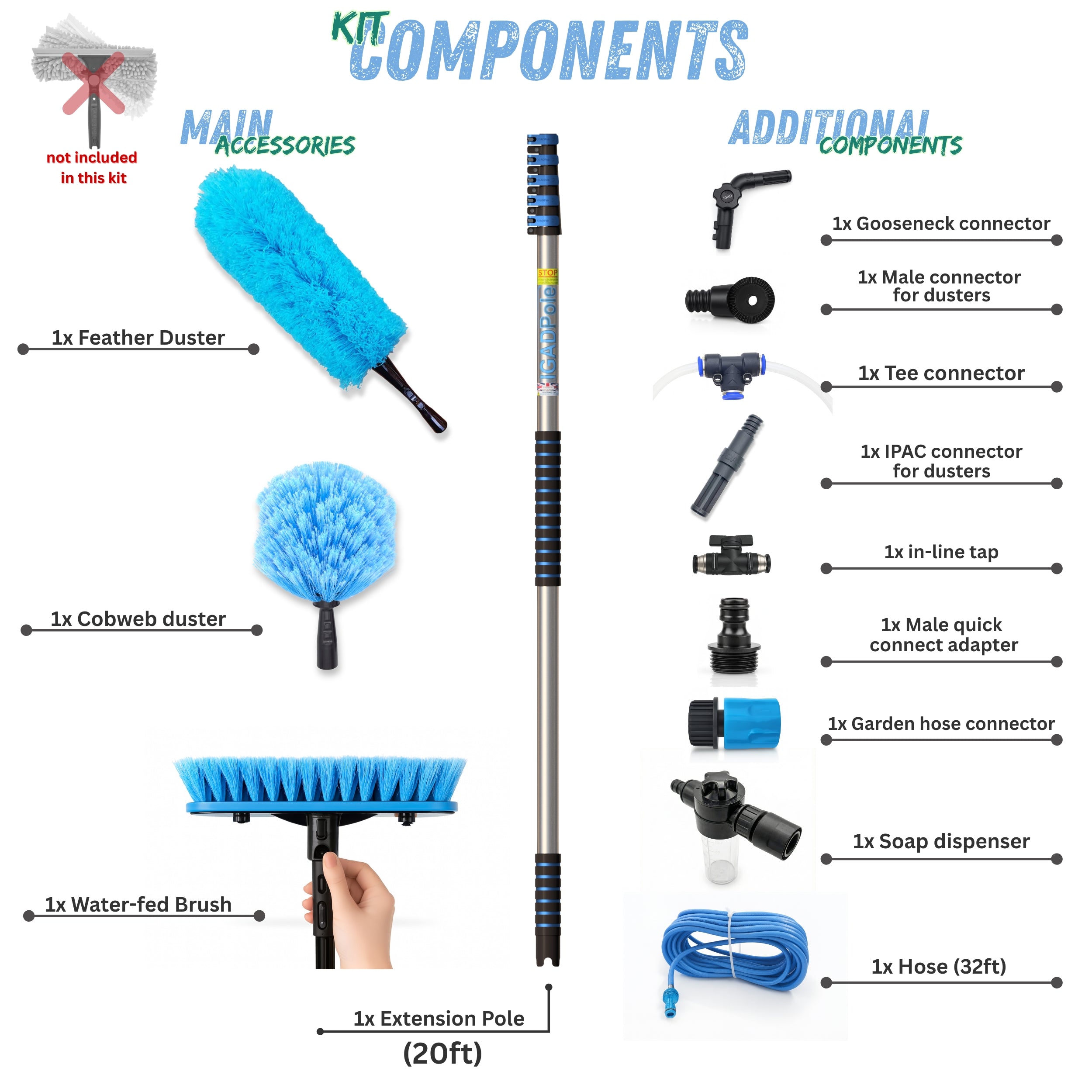 IGADPole 6m (20ft) Water-Fed Pole Cleaning Kit – Includes Water-fed Brush, Cobweb & Microfibre Duster, Soap Dispenser & Hose Tap