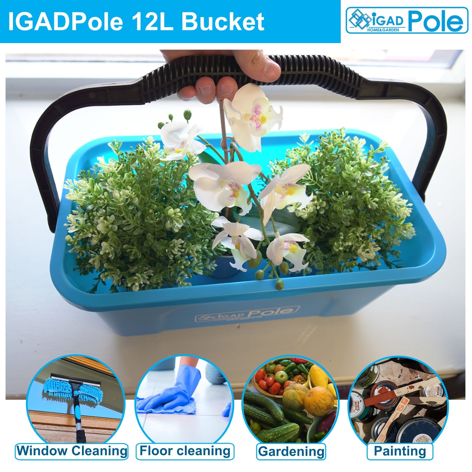 IGADPole Window Cleaning Bucket 12l + Free Microfibre Cleaning Cloths Set, 36 pcs Cleaning Cloths